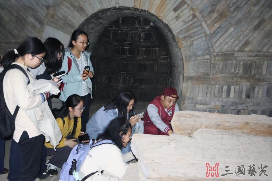2025年10月31日,南京大学文学院童岭老师带领“《三国志》研究”课程及21级硕士生第四、第五、第六党支部的同学,对南京市鼓楼区伍佰村丁奉墓、江宁区上坊镇孙吴大墓及万安陵进行了考察,南京市文化遗产保护研究院龚巨平副院长、丁奉家族墓地考古发掘项目负责人周保华老师等给予了考察指导。本次考察活动还得到了南京大学“研究生培养创新项目”及南京市考古研究院、江宁区文化遗产保护中心等的大力支持。 考察前童岭老师在课堂上的三国史料讲解 考察的第一站为伍佰村丁奉墓,墓葬所在区域位于南京市北郊幕府山南麓,共发现六朝时期砖室墓葬4座,墓葬均为南北向,东西并列分布,从西向东编号为2020NGWM2~5(以下简称M2~5),其中M3即为东吴大将丁奉墓。 墓葬分布平面图 《三国志·吴书·丁奉传》载:“丁奉字承渊,庐江安丰人也。少以骁勇为小将,属甘宁、陆逊、潘璋等。数随征伐,战斗常冠军。”丁奉为三国时期吴国名将,史称“江表之虎臣”。他一生历孙权、孙亮、孙休、孙皓四位吴主,在刀光剑影中亲身见证了三国的风云变幻,最终卒于吴建衡三年(271年)。 丁奉(?-271年)画像 同学们跟随童岭老师及周保华老师进入墓葬所在区域,雨后的地面有些泥泞,但这没有阻挡同学们探索的脚步,午后明亮的阳光重新照进尘封的墓室。 前往丁奉墓的考察队伍 周保华老师按照从M5到M2的顺序依次对墓葬建筑结构、用砖等进行详细介绍,四座墓葬均为竖穴土圹前后双室砖墓,其中M5前后室均为四隅券进式穹隆顶,前室左右和后室后部设有耳室;M4前室为四隅券进式穹隆顶,带左右耳室,后室券顶;M2、M3砖室为四边券进式穹隆顶,M3前室设有东侧室,且有二次合葬的痕迹。 当同学们随着周老师的讲解来到M3号墓葬,本次考察迎来了第一个高潮。通过M3出土的买地券及后室二次修补痕迹,可认定M3为东吴虎将丁奉及其夫人的合葬墓。历史与现实在此刻共鸣,同学们激动地拿出《三国志》《南方的将军》等书,在这里留下一张跨越千年时光的珍贵合影。 丁奉买地券拓本及原文 《三国志》原文与丁奉墓合影 张磊夫《南方的将军》(徐缅译)与丁奉墓合影 丁奉一生骁勇善战,最终位达三公,而M3的墓葬规格却远低于墓主人丁奉的身份。周保华老师指出,这一现象很可能源自这是一处夫妻合葬墓。 丁奉夫人买地券拓本 从出土的买地券来看,“庐江安丰离妃”,即丁奉夫人安葬于太元元年(公元251年),而丁奉则安葬于建衡三年(公元271年),和他的夫人相差了20年。而太元二年(公元252年)才发生了让丁奉名声大振的东兴之战,丁奉夫人下葬时丁奉的权位并不高,因此墓葬的规格不高,待丁奉死后便与其夫人合葬,因此才出现了墓葬规格远低于其身份的现象。 《三国志·吴书·陆凯传》中记载:“或曰宝鼎元年十二月,凯与大司马丁奉、御史大夫丁固谋,因晧谒庙,欲废晧立孙休子。”传言中这场针对孙晧的政治行动没有成功,自此孙晧对丁奉处处提防,其家人都遭到了贬斥和流放。或许在丁奉去世后,他的家人们没有精力再为他新建一座墓。考古实物与文献的互证为了解孙吴时期相关的政治、经济、文化方面的内容打开了一扇窗口。 离开伍佰村丁奉墓,老师同学们来到此行的第二站——孙吴上坊大墓。跨越历史的兴奋余韵还未散去,同学们便得知了一个更加激动人心的消息:老师将带领大家下墓考察。 “上坊孙吴墓”文保碑前合影 上坊孙吴墓前对青龙山,背依黄龙山,“前有照,后有靠”,是中国迄今发现的规模最大、结构最复杂、出土瓷器最多的孙吴墓葬。芒草婆娑立野径,风过簌簌似龙吟,我们沿着沙石小径向着大墓进发。甫一进入棚屋,天光骤暗,仿佛时空倒转进入了另一个世界。 向着芒草深处的大墓进发 据《南京江宁上坊孙吴墓发掘简报》(《文物》杂志2008年12月刊,总第六三一期,第4-34页)所撰,墓葬为土坑竖穴砖室墓,砖室长20.6、宽10.71米,由封门墙、石门、甬道、前室、过道、后室组成,前、后室的两侧对称有耳室,后室的后壁底部还有2个壁龛。令大家感到惋惜的是,墓葬遭到严重盗掘,后部有一直径达6.8米的盗洞,前室的顶部也被施工机械破坏。 墓室外景 顺着墓道下行便至墓门,除东侧的门柱及部分门槛、门楣尚在原处,其余构件或遭盗墓者破坏,或被移至甬道中部,甬道为券顶,长5米。随着最后一缕阳光被切割在门外,一阵凉气扑面而来。 同学们跟随老师“下大墓” 前室为四隅券进式穹隆顶,长、宽约4.5米,墓顶原嵌有覆顶石,四角各雕一个起降用的吊环,中央方框内雕有神兽纹,惜在发掘前已遭施工破坏,现在所见为仿制品。 墓顶覆斗状覆顶石仿制品 前室四角中部距墓底1.4米处各嵌一牛首形石雕,墓室建造时从四个牛首开始起券,形成方弧形圈砌结构,不仅创造了更大的墓室内部空间,更使墓顶抗压强度显著增强。此外,牛首也是摆放灯具的灯台,其中一个壁面残留有烟熏的痕迹。 牛首形石雕 周老师为大家细致讲解墓葬建筑结构 前室中部两侧有对称分布的长方形耳室,均为券顶,随着老师细致的讲解,同学们逐渐深入墓室,通过一段长约1.7米的过道行至后室。后壁底部有2个壁龛,四角距墓底约1.4米处亦有牛首形石灯台,后室中部偏前两侧有对称分布的长方形耳室。 向墓室深处行进 进入后室后部,中央摆放的两组四件石棺座赫然呈现在眼前。木棺在漫长的时间中已经朽坏,石棺座的两